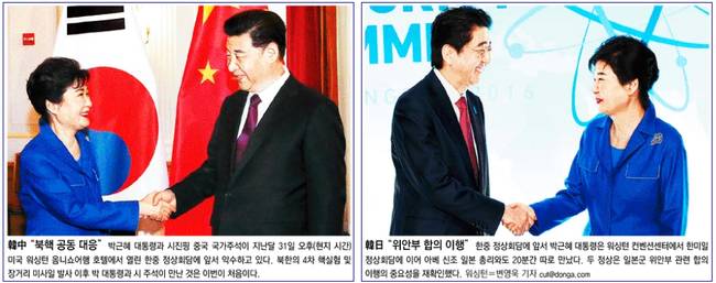 동아일보는 박근혜 대통령과 시진핑 중국 국가주석이 지난달 31일 오후(현지 시간) 미국 워싱턴 옴니쇼어햄 호텔에서 열린 한·중 정상회담에서 앞서 악수하는 장면과 한중 정상회담에서 앞서 박 대통령이 워싱턴 컨벤션센터에서 한·미·일 정상회담에 이어 아베 신조 일본 총리와도 20분간 따로 만난 장면을 함께 실었다.