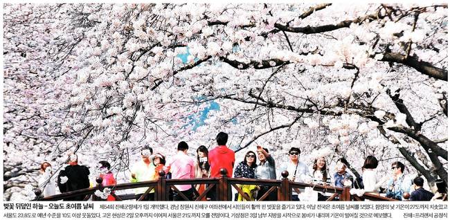 조선일보, 중앙일보는 국내 최대 벚꽃 축제인 진해 군항제가 1일 막을 올린 가운데 경남 창원시 여좌천을 찾은 시민들이 흐드러진 벚꽃 사이를 거닐며 봄을 즐기는 장면을 담았다.
