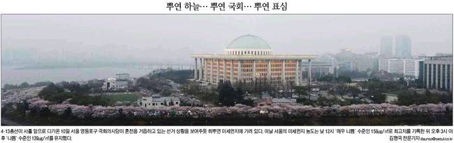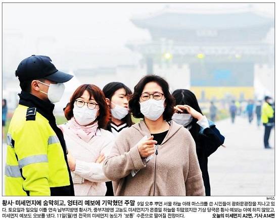 조선일보는 마스크를 쓴 시민들이 광화문광장을 지나고 있는 모습을 1면 사진으로 실었다. 조선일보는 "황사, 초미세먼지로 지난 주말 전국의 하늘이 온종일 음침했다. 하지만 기상 당국의 잇단 오보와 무신경으로 시민들은 황사·미세먼지의 습격에 속수무책 당하는 등 곤욕을 치렀다"고 했다.