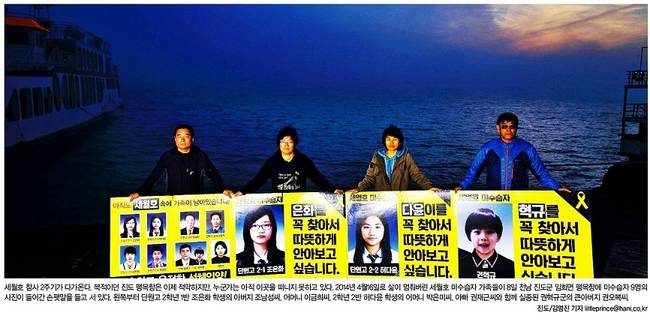 한겨레는 세월호 2주기를 앞두고 전남 진도군 팽목항에서 미수습자 9명의 사진이 들어간 손팻말을 들고 서 있는 미수습자 가족들의 사진을 1면에 담았다.