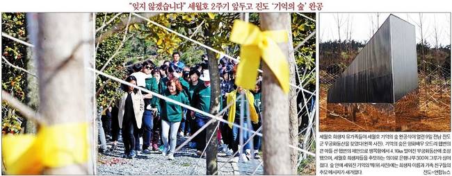 한국일보는 세월호 희생자 유가족들이 세월호 기억의 숲 완공식이 열린 전남 진도군 무궁화동산을 찾은 모습을 1면에 실었다. 한국일보는 "기억의 숲은 영화배우 오드리 햅번의 큰 아들 션 헵번의 제안으로 팽목항에서 4.16km 떨어진 무궁화동산에 조성됐다"며 "세월호 희생자들을 추모하는 의미로 은행나무 300여 그루가 심어졌다. 숲 안에 세워진 기억의 벽에는 희생자 이름과 가족 친구들의 추모 메시지가 새겨겼다"고 전했다.