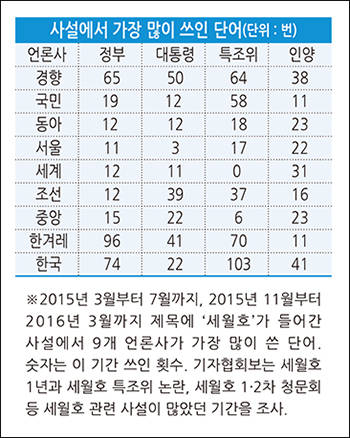 ▲2015년 3월1일~7월31일, 2015년 11월1일~2016년 3월31일 각 신문사 사설에서 많이 쓰였던 단어들.