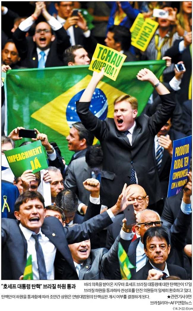 한국일보는 지우마 호세프 대통령에 대한 탄핵안이 브라질 하원을 통과하자 찬성표를 던진 의원들이 일제히 환호하고 있는 모습을 1면 사진으로 선택했다.