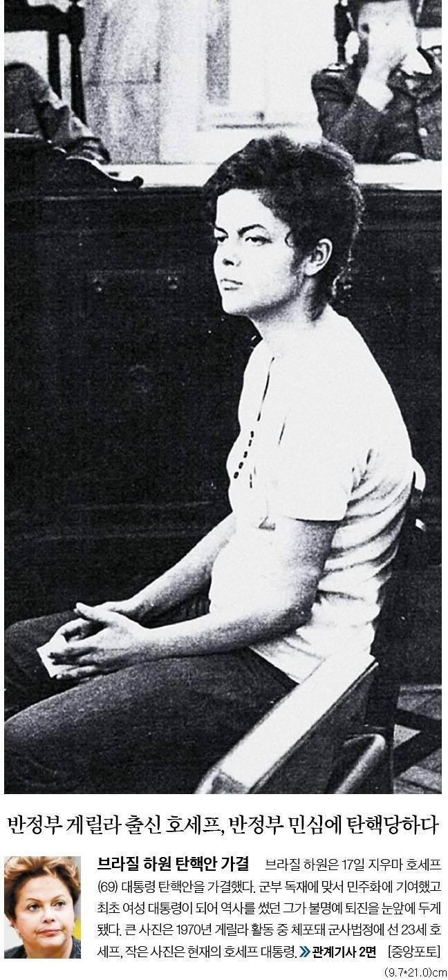 중앙일보는 1970년 군부독재에 맞선 게릴라 활동 중 체포돼 군사법정에 섰던 23세 호세프 대통령의 사진을 1면에 내걸었다.
