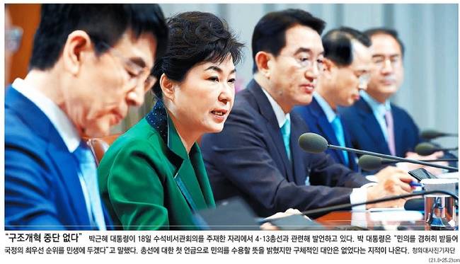 동아는 관련기사에서 “박근혜 대통령이 여당의 참패로 끝난 4·13총선 결과에 대해 18일 ‘국민의 민의를 겸허히 받들어 국정의 최우선 순위를 민생에 두겠다’며 ‘사명감으로 대한민국의 경제발전과 경제혁신 3개년 계획을 마무리하는 데 혼신의 노력을 다 하고자 한다’고 밝혔다”고 전했다. 동아는 “이는 박 대통령이 여소야대로 재편된 국회의 현실을 받아들이고, 정부 여당을 심판한 민심을 존중해 향후 국정 운영에 반영하겠다는 의지를 보인 것으로 풀이된다. 다만 국정 기조는 계속 유지하겠다는 뜻을 밝히면서 인적쇄신 등 구체적인 정국 수습 방안은 제시하지 않았다”고 게재했다.