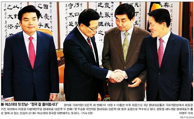 국민일보는 4·13총선 후 처음으로 원내대표들이 만나 악수하는 모습을 신문 1면에 올렸다. 국민은 관련기사에서 “19대 국회 마지막 임시국회가 오는 21일부터 한 달간 열린다. 4·13총선으로 20년만에 형성된 3당 체제를 대표하는 여야 3당의 원내 사령탑이 18일 이 같이 합의했다. 최악으로 불린 19대 국회에서 ‘유종의 미’를 거두자는 취지였다”고 보도했다. 국민은 그러면서 “하지만 각 당이 만족하는 입법 성정을 거둘지는 미지수다. 새누리당이 요구하는 노동개혁 4법과 서비스산업발전기본법, 사이버테러방지법처리는 여전히 ‘야2당’과의 입장차가 크기 때문”이라고 게재했다.