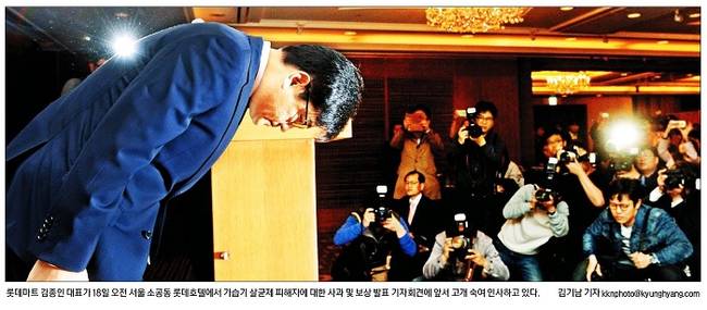 경향신문은 이날 롯데마트 김종인 대표가 기자회견 자리에서 사과하는 모습을 1면에 내걸었다.
