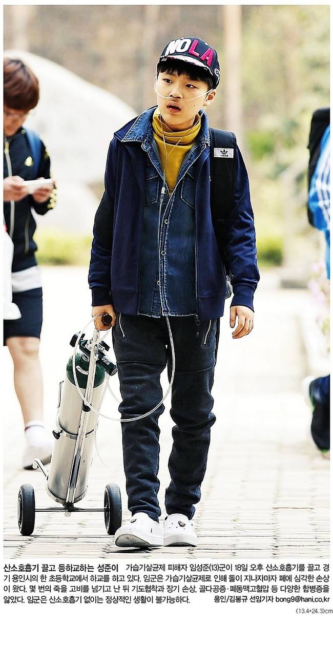 한겨레신문은 가습기살균제 피해자인 임성준 군이 산소호흡기를 끌고 하교하는 모습을 1면 사진으로 선택했다.