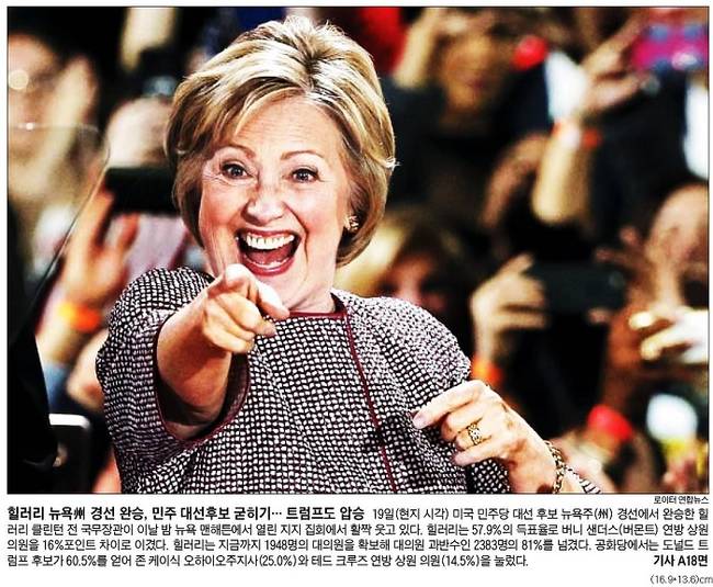 조선일보는 힐러리 클린턴 전 국무장관이 이날 지지 집회에서 활짝 웃고 있는 모습을 1면 사진으로 선택했다. 조선일보는 관련기사에서 “뉴욕주 경선에서 트럼프와 힐러리가 각각 압승하면서 2016년 미국 대선은 두 사람의 대결로 치러질 가능성이 점점 커지고 있다. 정치 전문 웹사이트인 리얼클리어폴리틱스가 지난 18일 집계한 양자 가상대결 여론조사에서는 힐러리가 48.8%를 차지해 트럼프(39.5%)를 9.3%포인트 앞서는 것으로 나타났다. 작년 여름까지는 가상대결에서 힐러리가 크게 앞섰으나 트럼프의 인기가 작년 가을부터 높아지면서 박빙을 유지하다가 최근에는 힐러리가 다시 앞서는 분위기”라고 전했다.