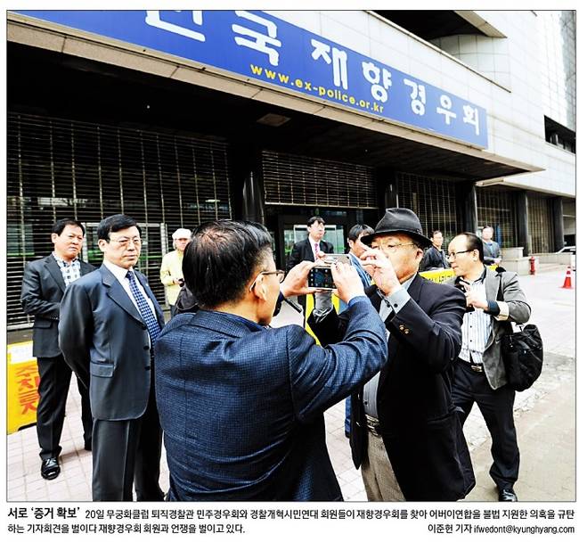 경향신문은 이와 관련해 20일 무궁화클럽 퇴직경찰관 민주경우회와 경찰개혁시민연대 회원들이 재향경우회를 찾아 어버이연합을 불법 지원한 의혹을 규탄하는 기자회견을 벌이다 재향경우회 회원과 언쟁을 벌이는 모습을 신문 전면에 배치했다. 경향은 관련기사에서 “20일 경향신문 취재결과 어버이연합의 차명계좌에 전경련 입장을 대변하는 집회를 수차례 개최했다. ‘노동관련법 처리 촉구’ 시위가 대표적”이라며 “해당 법안은 비정규직 파견 범위와 기간 확대 등의 내용을 담고 있어 노동계에선 ‘악법’으로 불리지만 통과될 경우 전경련에는 유리한 법안들”이라고 설명했다.