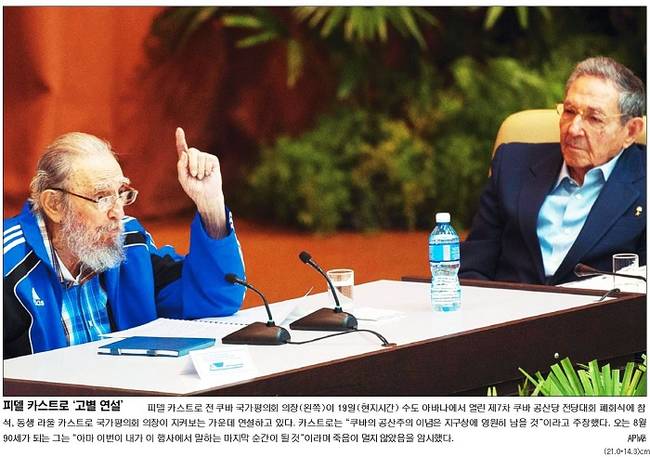 중앙은 관련기사에서 “쿠바 혁명 지도자 피델 카스트로(89)가 사실상 고별 연설을 했다. 카스트로는 19일(현지시간) 쿠바 아바나에서 열린 공산당 7차 당 대회 폐막 연설에서 ‘나는 곧 90세가 된다. 모든 사람에게 그렇듯 시간은 찾아온다’고 말했다”고 전했다. 중앙은 이어 “파란색 아디다스 트레이닝 복 상의를 입은 카스트로는 ‘아마 이번이 내가 이곳에서 연설하는 마지막 순간이 될 것’이라며 ‘그렇지만 우리가 열정과 존엄을 갖고 투쟁해 나가면 인류가 필요로 하는 물질적·문화적 결과물을 얻어낼 수 있다는 증거로서 쿠바 공산주의 이상은 영원할 것’이라고 말했다”고 보도했다.