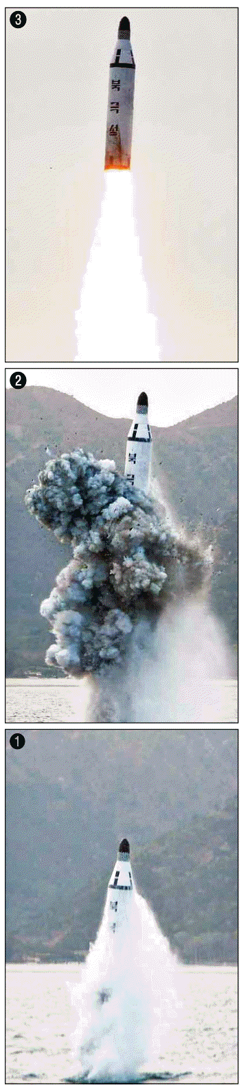 북한이 23일 동해에서 잠수함 발사 탄도미사일(SLBM) 시험발사에 성공했다. 북한이 공개한 발사 장면에는 보호캡슐에 들어있는 탄도미사일이 잠수함에서 물 밖으로 솟구친 뒤 비행하는 모습이 담겨있다. 이날 국민일보와 동아일보, 한겨레는 북한의 이같은 동향을 1면 사진으로 보도했다.