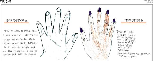 경향신문은 노동절을 맞이해 흉터와 굳은살로 상징되는 아빠 손과 상처투성이의 엄마 손을 1면 사진에 담았다. 경향은 서울의 초등학생 110명을 대상으로 설문조사한 결과를 보도하며 “부모님 손을 그린 학생들은 한결 같이 부모의 일에 대해서는 고마움을 표시했지만 노동, 노동자라는 단어는 부정적인 뜻으로 인식하는 경향이 강했다”고 전했다. 경향에 따르면 ‘노동’이라는 말을 듣고 ‘힘듦’이나 ‘노예’라는 단어를 떠올리는 학생이 많았다.