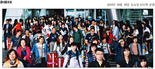 세계일보와 조선일보는 노동절을 맞이해 중국 관광객이 한국으로 몰려들어오는 모습을 1면 사진에 담았다. 세계일보는 ‘중일 황금연휴 몰려오는 관광객’이라는 제목을 통해 “중국 노동절 연휴인 4월 20일부터 5월 2일, 일본 골든위크인 4월 29일부터 5월 8일 일정이 겹치며 한국을 찾은 관광객들이 인천국제공항 입국장을 나서고 있다”고 밝혔다.