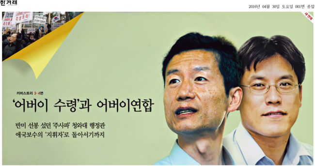 이날 한겨레신문은 ‘어버이 수령과 어버이연합’이라는 헤드라인을 통해 반미 선봉 섰던 주사파 청와대 행정관이 애국보수의 지휘자로 돌아서기까지의 모습을 커버스토리로 담았다. 한겨레는 “최근 대한민국어버이연합 파문의 중심에 선 허현준 청와대 국민소통비서관실 선임행정관은 전향 주사파”라며 “1990년대 주체사상을 지도이념으로 했던 민족민주혁명당 전북위원회 산하에서 일하다 강철서신의 저자 김영환씨를 따라 북한민주화 운동으로 180도 노선 전환을 했다”고 밝혔다. 한겨레는 “전향 주사파가 극우단체와 재벌단체의 결합에 연루됐다는 최근 의혹은 엔엘(NL, 민족해방)과 주사파 논란의 진폭과 파장이 얼마나 크고 광범위한지를 상징적으로 보여준다”며 30년 전의 엔엘 운동을 특집 기사로 선보였다.