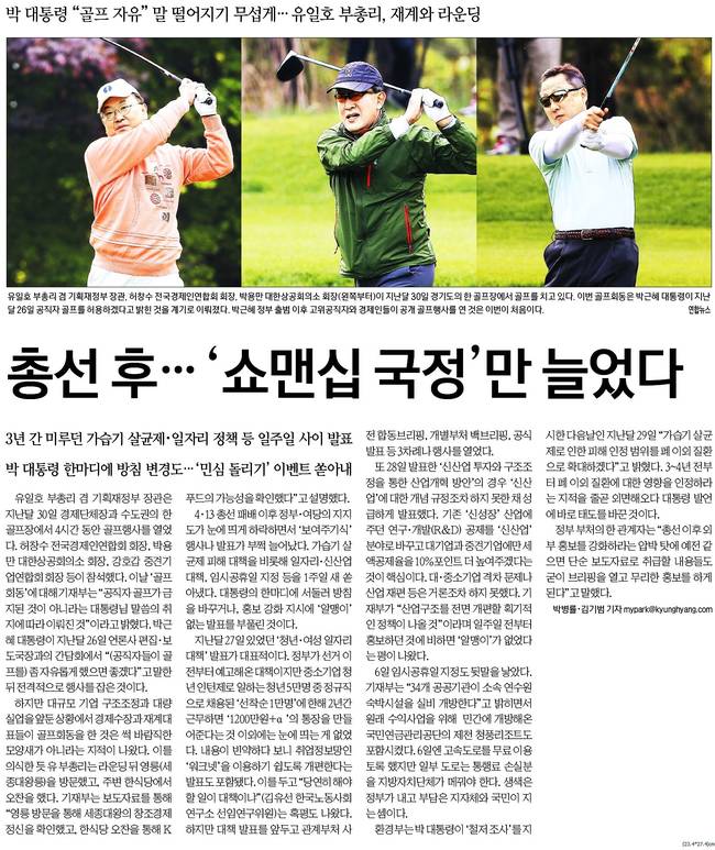 하지만 경향은 "대규모 기업 구조조정과 대량실업을 앞둔 상황에서 경제수장과 재계 대표들이 골프회동을 한 것은 썩 바람직한 모양새가 아니라는 지적이 나왔다"고 전했다.
