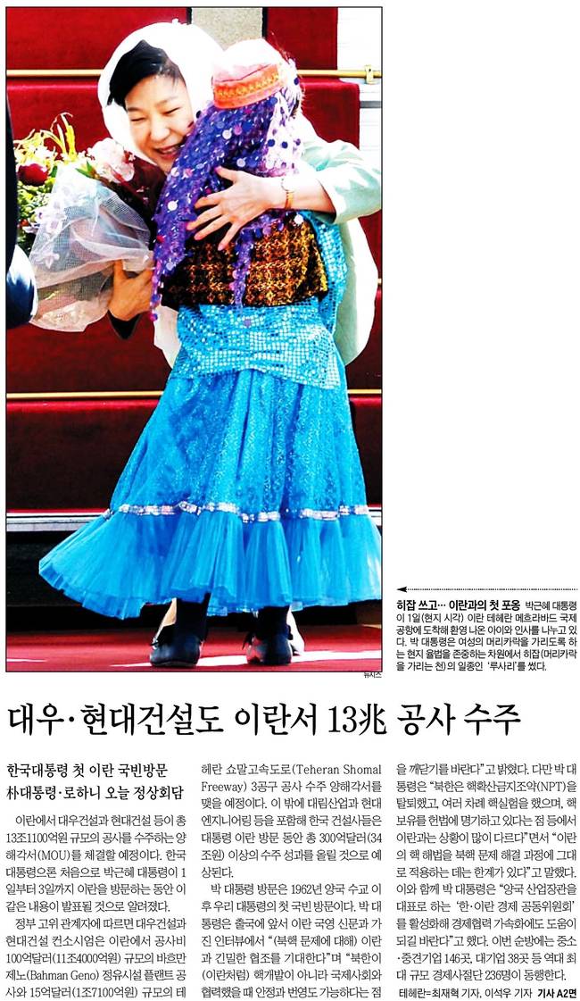 동아일보, 조선일보, 한겨레, 한국일보도 한국 역대 대통령 중 처음으로 이란을 방문한 박 대통령이 1일 오후 수도 테헤란 메라바드 공항에 도착해 이란 어린이로부터 꽃다발을 받고 있는 모습을 담았다.