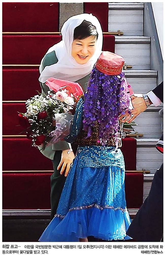 박 대통령은 이슬람 문화를 존중하는 차원에서 이란식 히잡 '루사리'를 착용했다. 박 대통령은 2박4일의 국빈방문 일정에 돌입, 1962년 양국 수교 이후 우리 대통령 중 처음으로 이란을 방문했다. 이번 일정 중 박 대통령은 아야톨라 알리 하메네이 최고지도자를 만날 예정이다.