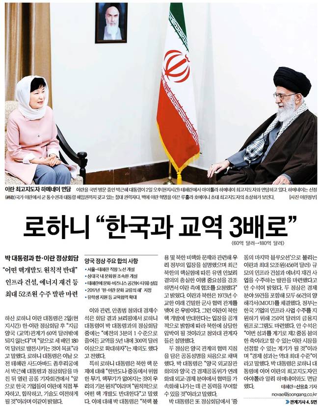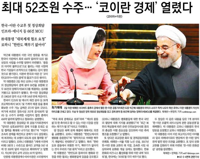 경향신문은 3일자 1면 사진으로 이란을 국빈 방문 중인 박근혜 대통령이 2일 테헤란 사드아바드 좀후리궁에서 하산 로하니 이란 대통령과 정상회담을 하기에 앞서 환담을 하고 있는 모습을 담았다. 한‧이란 정상회담은 1962년 수교 이후 54년 만에 처음 열린 것이다.