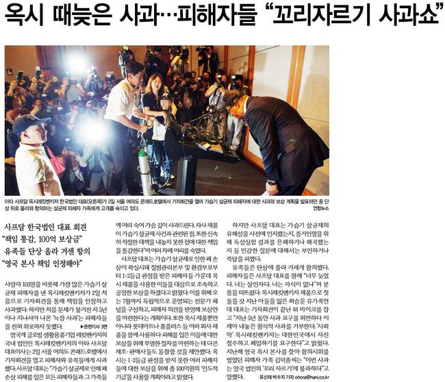 한겨레는 아타 사프달 옥시레킷벤키저 한국법인 대표(오른쪽)가 2일 서울 여의도 콘래드 호텔에서 기자회견을 열어 가습기 살균제 피해자에 대한 사과와 보상 계획을 발표하던 중 단상 위로 올라와 항의하는 살균제 피해자 가족에게 고개를 숙이는 장면을 담았다.