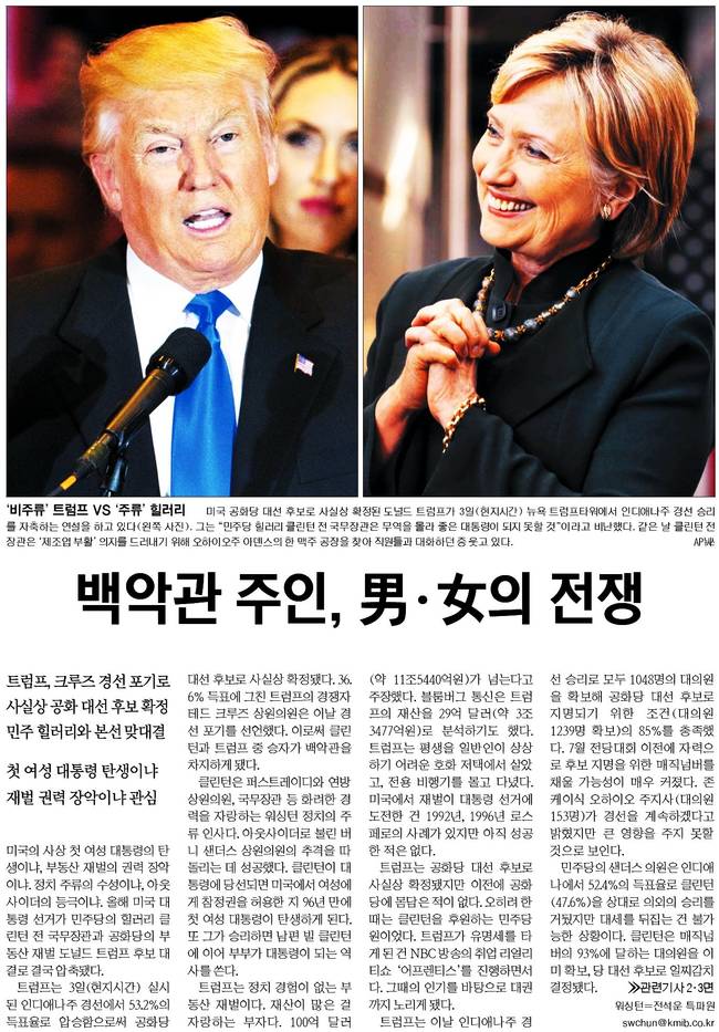 국민일보는 미국 공화당 대선 후보로 사실상 확정된 도널드 트럼프가 3일(현지시간) 뉴욕 트럼타워에서 인디애나주 경선 승리를 자축하는 장면(왼쪽 사진)과 같은 날 클린턴 전 장관이 '제조업 부활'의지를 드러내기 위해 오하이오주 아덴스의 한 맥주 공장을 찾아 직원들과 대화하던 중 웃고 있는 모습을 전했다.