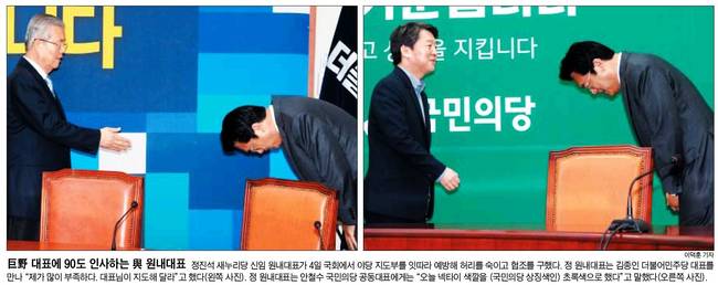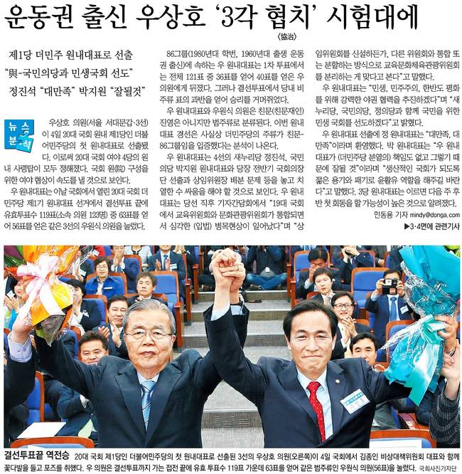 동아일보, 세계일보는 20대 국회 제1당인 더불어민주당의 첫 원내대표로 선출된 3선의 우상호 의원(오른쪽)이 4일 국회에서 김종인 비상대책위원회 대표와 함께 꽃다발을 들고 포즈를 취한 장면을 실었다.