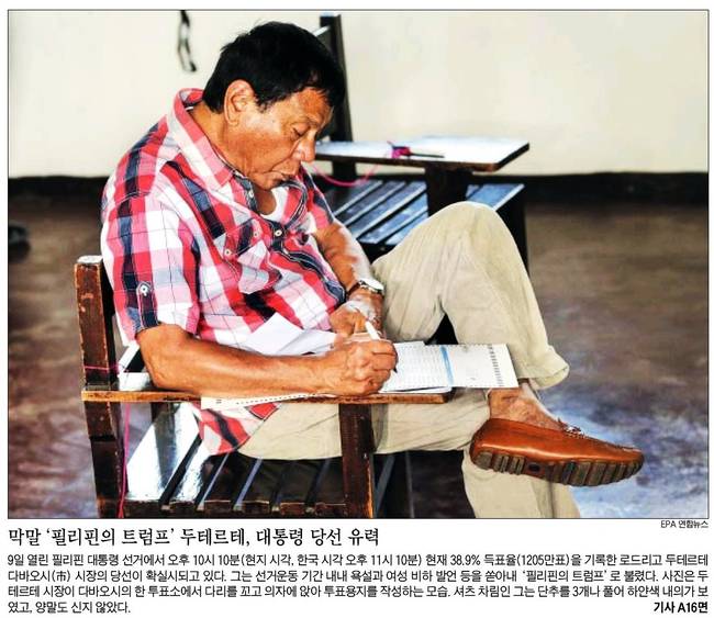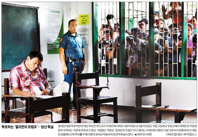 조선일보와 한국일보는 '필리핀의 트럼프'라 불리는 로드리고 두테르테 디바오시 시장의 모습을 1면에 실었다. 두테르테 시장이 필리핀 대통령 선거에서 당선이 확실시되고 있다는 소식도 덧붙였다.