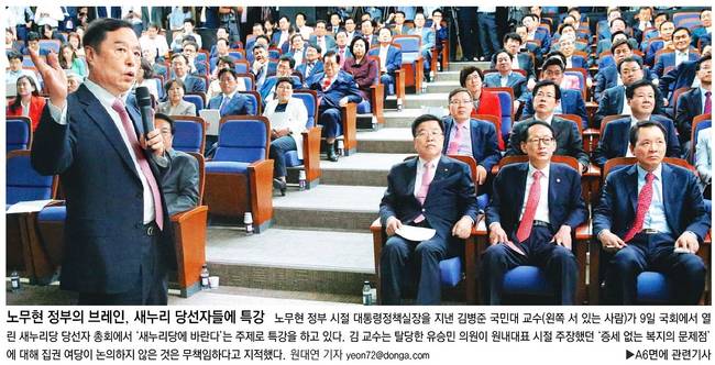 동아일보는 노무현 정부 시절 대통령정책실장을 지낸 김병준 국민대 교수가 새누리당 당선자 총회에서 특강하는 모습을 1면에 실었다. 동아일보는 "김 교수는 9일 국회에서 열린 특강 '새누리당에 바란다'에서 당 주류인 친박계가 유승민 의원을 비롯한 비박계를 배제하는 등 공천을 주도한 총선을 두고 "당내 세력 재편을 위한 선거였다"고 비난했다"며 "정치인은 문제를 정확히 진단하고 대안을 내놓아야지 국민에게 표를 얻기 위해 사과해선 안 된다고 고언하기도 했다"고 전했다.