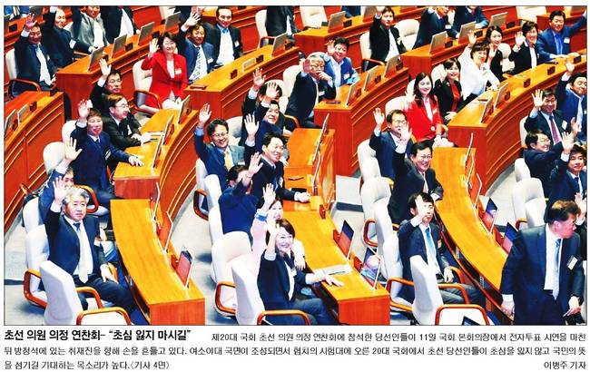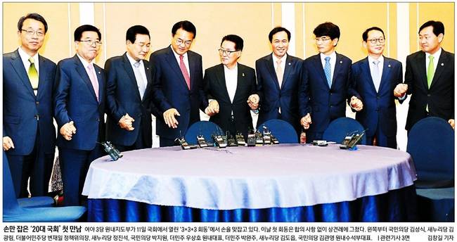여야 3당 새 원내지도부가 11일 '20대 국회' 첫 만남을 가졌다. 경향신문, 동아일보, 세계일보, 중앙일보는 새누리당 정진석, 더불어민주당 우상호, 국민의당 박지원 원내대표 등이 손을 맞잡은 사진을 1면에 싣고 대화 내용을 분석해 보도했다. 같은 날 20대 국회 초선의원들이 국회 본회의장을 방문했는데, 서울신문과 국민일보는 이 모습을 1면에 담았다.