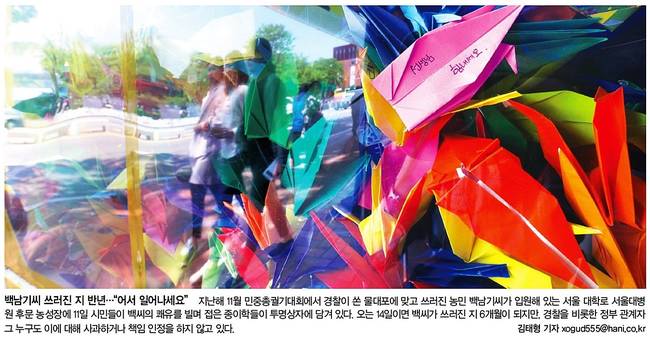 한겨레는 지난해 11월 민중총궐기대회에서 경찰이 쏜 물대포에 맞고 쓰러진 농민 백남기씨의 쾌유를 비는 종이학 사진을 1면에 담았다.