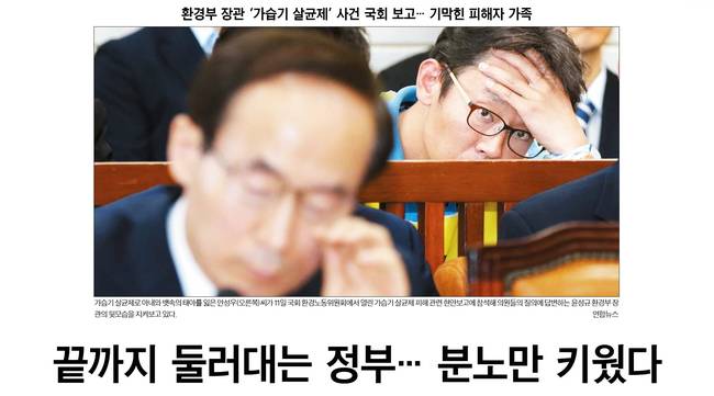 한국일보는 11일 국회 환경노동위원회에서 열린 가습기 살균제 피해 관련 현안보고에 참석한 윤성규 환경부 장관과 그 모습을 지켜보는 피해자 가족의 모습을 실었다.