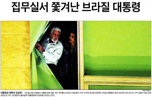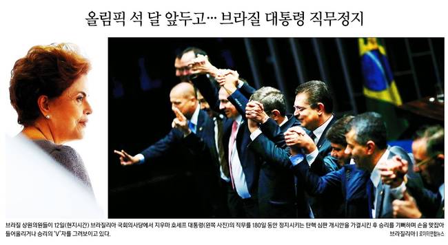 브라질 상원이 12일(현지시간) 지우마 호세프 대통령에 대한 탄핵심판 개시안을 통과시켰다. 상원 전체의원 81명 중 55명이 심판 개시에 찬성하면서 호세프 대통령의 직무는 정지됐다. 13일 경향신문, 국민일보, 세계일보, 조선일보, 한국일보 등은 호세프 대통령의 모습을 1면에 싣고 관련 기사를 보도했다.