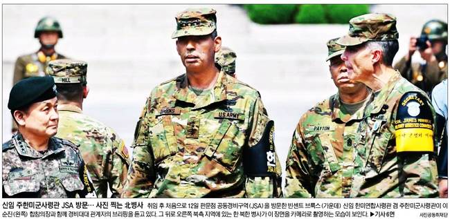 동아일보, 서울신문, 중앙일보는 지난달 30일 부임한 빈센트 브록스 신임 주한미군사령관이 첫 공개 활동으로 이순진 합참의장과 판문점 공동경비구역(JSA)을 방문한 모습을 1면에 담았다.