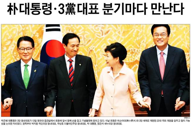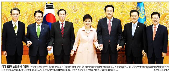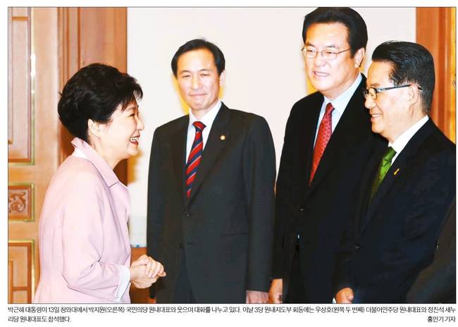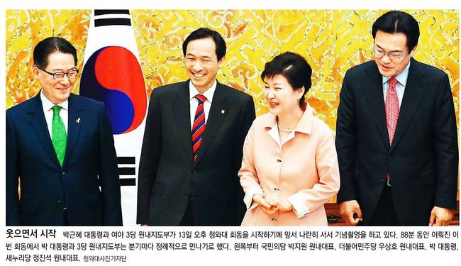 박근혜 대통령과 여야 3당 원내지도부는 13일 청와대에서 첫 회동을 가졌다. 대통령과 여야 대표 회동을 분기마다 한 번씩 정례화하고 유일호 경제부총리 겸 기획재정부 장관과 여야 3당 정책위의장이 참석하는 민생경제 현안 점검회의도 조속히 개최하기로 합의했다.