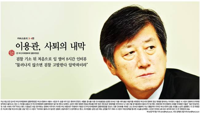 한겨레는 이용관 전 부산국제영화제 집행위원장 모습을 1면에 싣고 커버스토리로 부산영화제 논란을 자세히 다뤘다.
