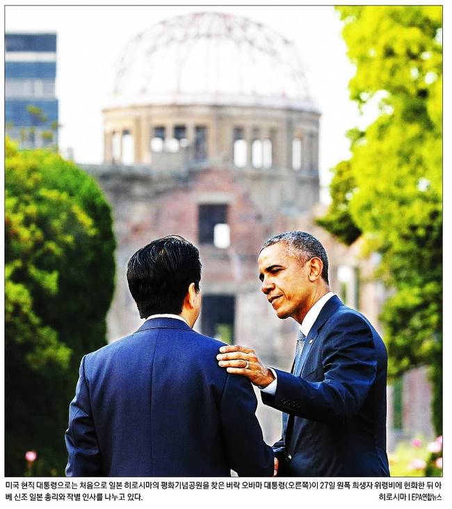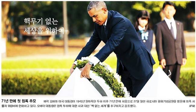 버락 오바마 미국 대통령이 27일 현직 미국 대통령으로는 처음으로 일본 히로시마를 방문해 원폭 희생자들의 위령비에 헌화하고 묵념했다. 1945년 8월 6일 미국이 이곳에 원폭을 투하한 지 71년 만이다. 하지만 오바마 대통령은 북서쪽으로 150m거리에 있는 한국인 희생자 위령비는 찾지 않았다. 다만 위령비 헌화 후 이어진 17분 동안의 연설 중 “여기에는 10만 명 이상의 일본인, 수만 명의 한국인, 그리고 일군의 미군 포로들이 있었다. 그들의 영혼이 우리에게 말한다”고 언급했다. 28일 거의 모든 주요 일간지들은 이와 관련한 소식들을 신문 전면에 내걸었다.
