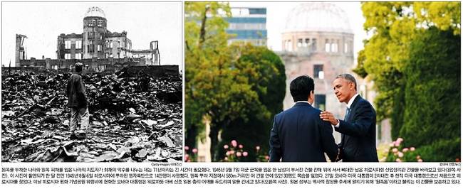 조선일보는 1945년 9월7일 미국 군복을 입은 한 남성이 부서진 건물 잔해 위에 서서 뼈대만 남은 히로시마현 산업장려관 건물을 바라보는 모습과 오바마 대통령이 헌화 뒤 아베 총리의 일본 어깨 총리 어깨를 두드리며 말을 건네는 모습을 나란히 배치했다.
