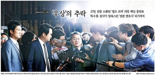 한겨레신문은 정운호 네이처리퍼블릭 대표의 전관 로비 의혹에 연루된 홍만표 변호사가 27일 오전 소환 조사를 받기 위해 서울 서초구 서울중앙지검에 들어서며 기자들의 질문에 답하는 모습을 신문 1면에 배치하며, 관련 소식을 다뤘다.