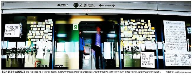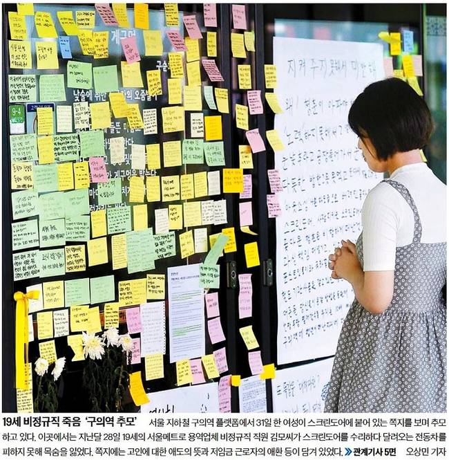 19세 비정규직 노동자가 밥먹을 시간도 없이 일을 하다가 변을 당한 구의역 스크린도어 사고 현장에 시민들의 발걸음이 끊이지 않고 있다. 이들은 스크린도어 정비 작업 중 사망한 이 청년을 추모하는 내용의 메시지를 붙이거나 꽃을 놓으며 고인의 죽음을 추모하는 물결을 이어가고 있다. 정치권의 방문도 잇따르고 있으며 사고원인, 대책과 관련한 다양한 소식과 보도도 나온다. 이날 상당수 주요 일간지들은 이와 관련한 사진을 신문 전면에 내세웠다.