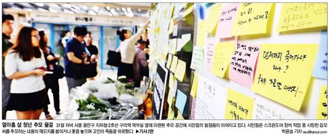 중앙일보는 구의역 플랫폼에서 한 여성이 스크린도어에 붙어있는 쪽지를 읽으며 추모하고 있는 모습을 전면에 내걸었다. 중앙은 관련기사에서 “포스트잇 추모는 여성, 비정규직 근로자 등 사회적 약자가 희생된 사건·사고에서 비롯됐다. 그래서인지 추모 행렬에 참여한 시민은 대부분 여성이나 20-30대 젊은층이었다”면서 “이전까지 인터넷 공간에서 ‘흙수저론’ ‘헬조선’ 등 자조적인 목소리를 되풀이해 내던 것과는 전혀 다른 양상이나다. 전문가들은 이른바 ‘마이너리티’들의 공감과 불안, 울분이 포스트잇을 매개로 현실공간에서 극적으로 표촐됐다고 분석한다”고 전했다.