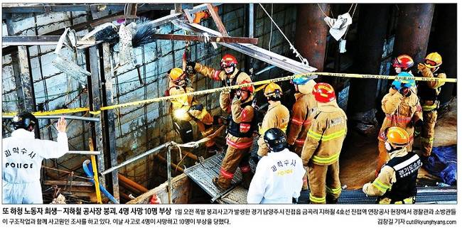 경향신문은 1일 오전 폭발 붕괴사고가 발생한 경기 남양주시 지하철 4호선 진접역 연장공사 현장에서 소방관과 경찰관들이 구조작업과 함께 사고원인 조사를 하는 모습을 1면에 담았다. 경향은 관련기사에서 “대한민국의 ‘경제’ ‘안전’ ‘환경’에 모두 ‘빨간불’이 켜지며 붕괴 조짐이 나타나고 있지만 출구가 보이지 않고 있다. 특히 정부가 대책을 마련하지 못하고 우왕좌왕하면서 컨트롤타워 부재 문제가 도드라지는 상황이다. ‘3중 붕괴’ 위기에 처한 대한민국에 ‘정부는 없다’는 비판이 나온다”고 게재했다.