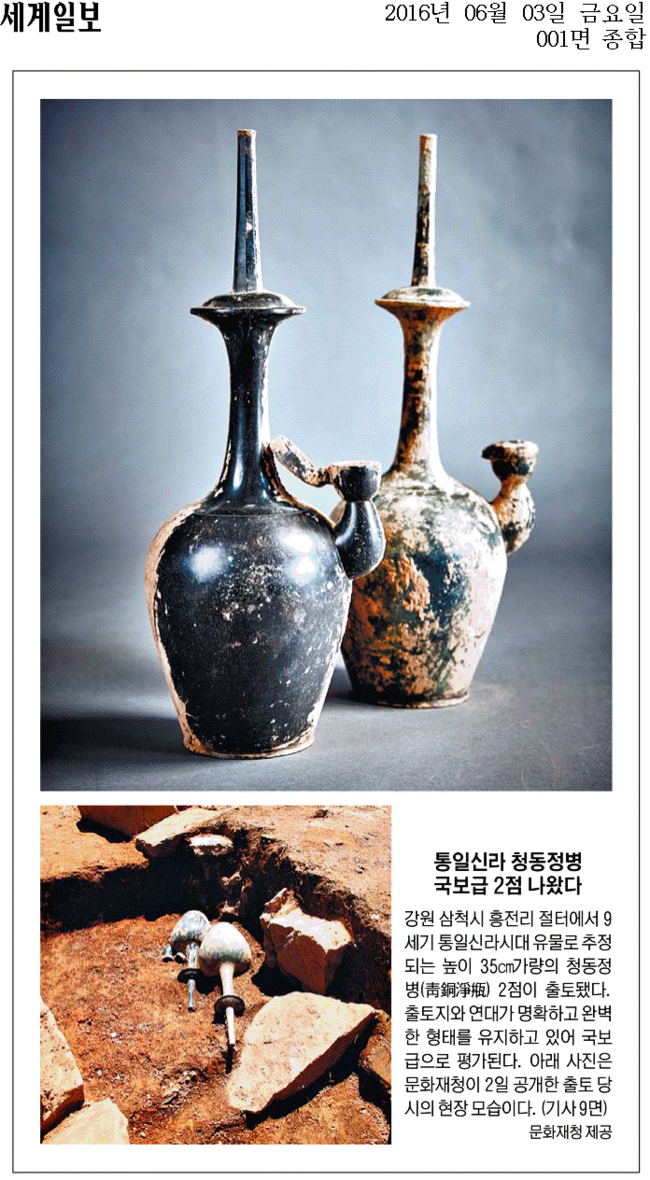 통일신라시대에 제작된 것으로 보이는 국보급 청동 정병 2점이 강원 삼척시 흥전리 절터에서 발굴됐다. 학계에서는 희귀한 통일신라시대 작품인데다 완벽한 형태에 보존상태도 좋고, 출토지가 명확해 국보급으로 평가한다. 3일 경향신문과 서울신문, 세계일보 등 조간신문은 국보급 정병 발굴 소식을 1면 사진으로 보도했다.