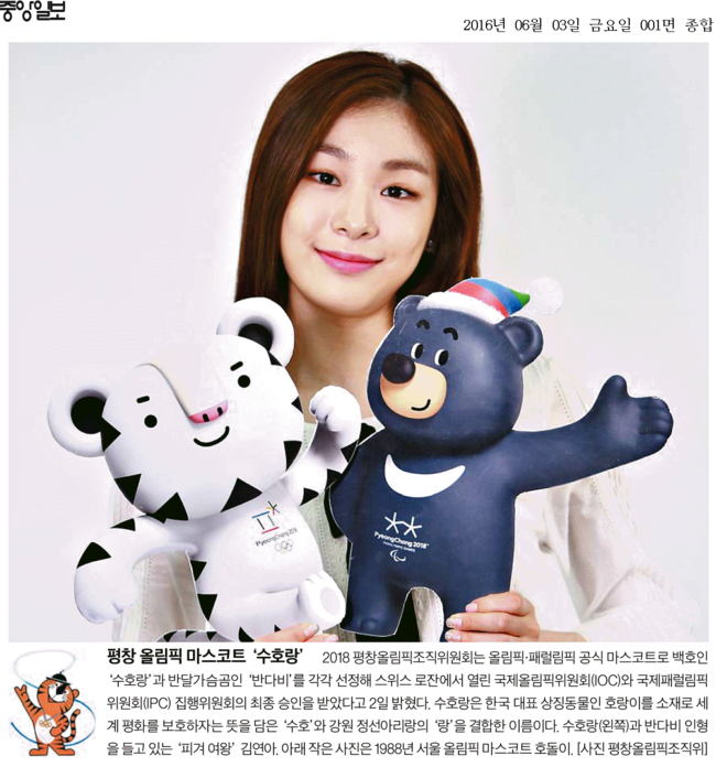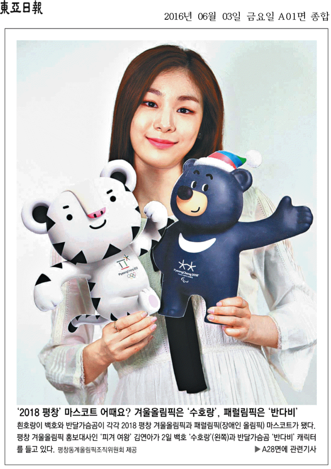 이날 동아일보와 중앙일보는 2018 평창 동계올림픽과 관련한 소식을 1면 사진에 담았다. 동아일보는 “공식 마스코트로 선정된 백호는 청룡, 주작, 현무와 더불어 사신의 하나로 서쪽 방위를 지키는 신령한 동물”이라며 “평창동계올림픽조직위원회가 백호를 마스코트로 택한 것은 산과 자연을 지키는 신성한 상상의 동물로 묘사돼 온 백호가 흰색을 좋아한 한국인의 정서를 대변하고, 하얀 눈 위에서 펼쳐지는 겨울올림픽과도 잘 어울린다고 판단했기 때문”이라고 설명했다.