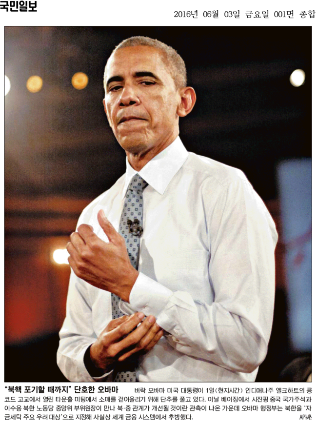 이날 국민일보는 북핵에 단호한 오바마 미국 대통령의 모습을 1면 사진으로 보도했다. 국민은 “북한과 미국, 중국이 핵과 달러를 놓고 3각 게임을 벌이고 있다”며 “시진핑 중국 국가주석과 이수용 북한 노동당 중앙위부위원장이 만나 북중이 관계 개선의 물꼬를 트자 미국이 북한을 세계 금융 시스템에서 몰아내는 조치를 취했다”고 전했다. 국민에 따르면 북한을 전략적 자산으로 보는 중국과 눈엣가시로 보는 미국 사이에 신경전이 치열해질 전망이다.