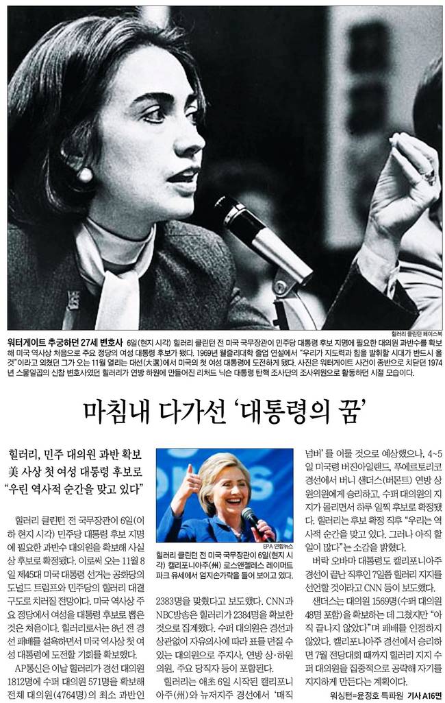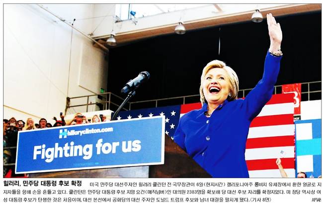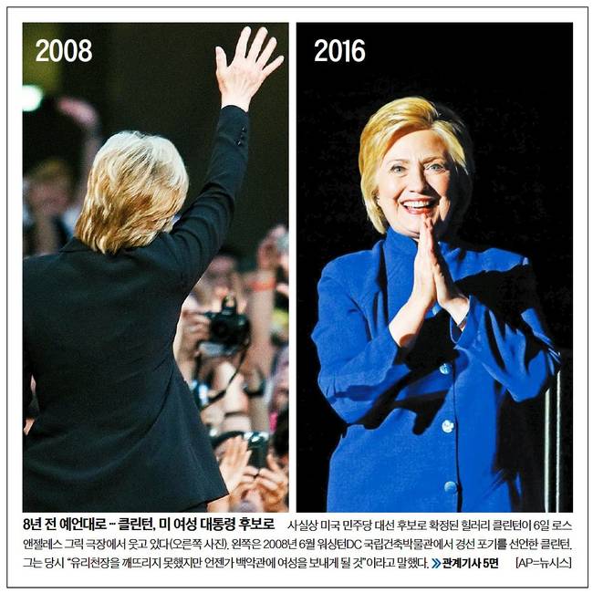 중앙일보는 미국 민주당 대선 후보로 확정된 힐러리 클린턴이 6일 로스앤젤레스 그릭 극장에서 웃고 있는 모습(오른쪽)과 2008년 6월 워싱턴 DC 국립건축박물관에서 경선 포기를 선언한 클린턴 모습을 함께 실었다.