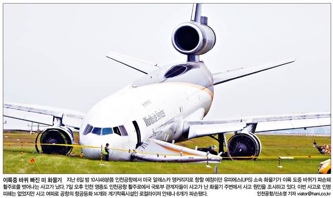 한겨레는 지난 6일 밤 10시48분쯤 인천공항에서 미국 알래스카 앵커리지로 향할 예정이던 유피에스(UPS) 소속 화물기가 이륙 도중 바퀴가 파손돼 활주로를 벗어나는 사고가 났다며 7일 오후 인천 영종도 인천공항 활주로에서 국토부 관계자들이 사고가 난 화물기 주변에서 사고 원인을 조사하고 있는 장면을 담았다.