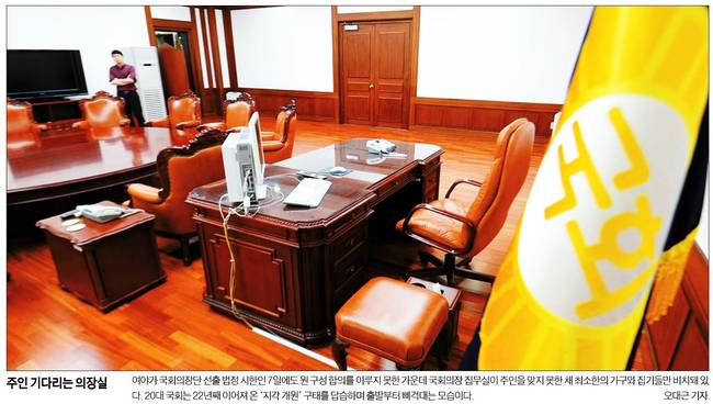 한국일보는 여야가 국회의장단 선출 법정 시한인 7일에도 원 구성 합의를 이루지 못한 가운데 국회의장 집무실이 주인을 맞지 못한 채 최소한의 가구와 집기들만 비치 됐다고 전하며 국회의장 집무실 모습을 담았다.