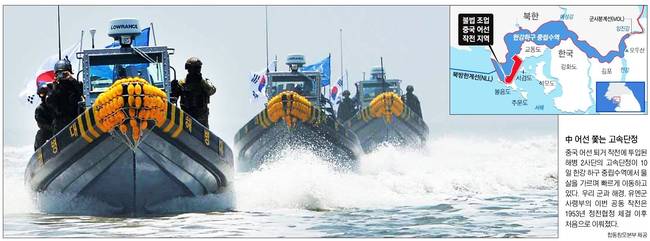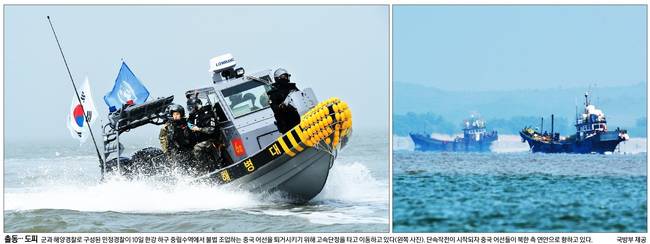 군과 해양경찰, UN군 사령부가 10일 한강 하구에서 불법 조업하는 중국어선 퇴거 작전에 나섰다. 한강 하구 중립수역은 강에 설정된 비무장지대로 군과 해경이 이곳에서 공동작전을 펼친 것은 1953년 정전협정 체결 이후 처음이다. 11일 종합일간지 대부분은 이 모습을 1면에 실었다.