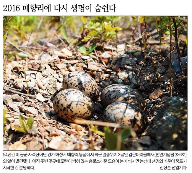 한국일보는 "54년간 미 공군 사격장이던 경기 화성시 매향리 농섬에서 최근 명종위기 2급인 검은머리물떼새(천연기념물 326호)의 알이 발견됐다"며 "아직 주변 곳곳에 포탄이 박혀 있는 흉물스러운 모습이 눈에 띄지만 농섬에 생명의 기운이 움트기 시작한 건 분명하다"고 전했다.