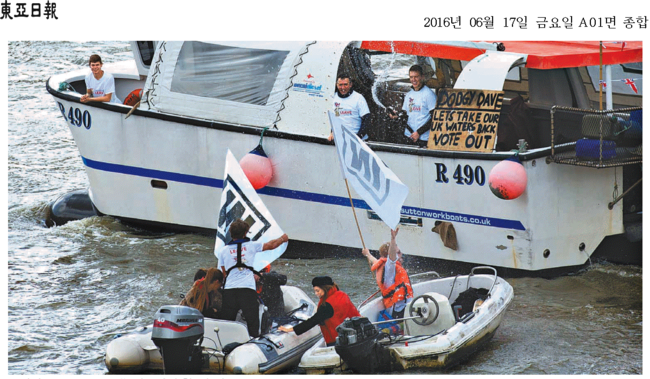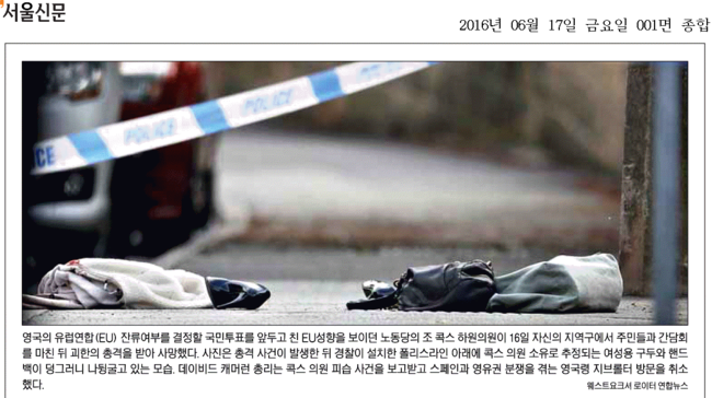 영국의 유럽연합 탈퇴(브렉시트)를 묻는 국민투표가 일주일 앞으로 다가오면서 정계와 재계, 언론 등 각계에서 충돌이 격화하고 있는 가운데 16일 요크셔 버스톨에서 친 EU성향의 현역 하원의원이 괴한으로부터 총격을 당해 사망하는 사건이 발생했다. 동아일보와 서울신문, 한국일보 등 17일 조간신문들은 브렉시트를 둘러싼 갈등 모습을 1면 사진으로 보도했다.
